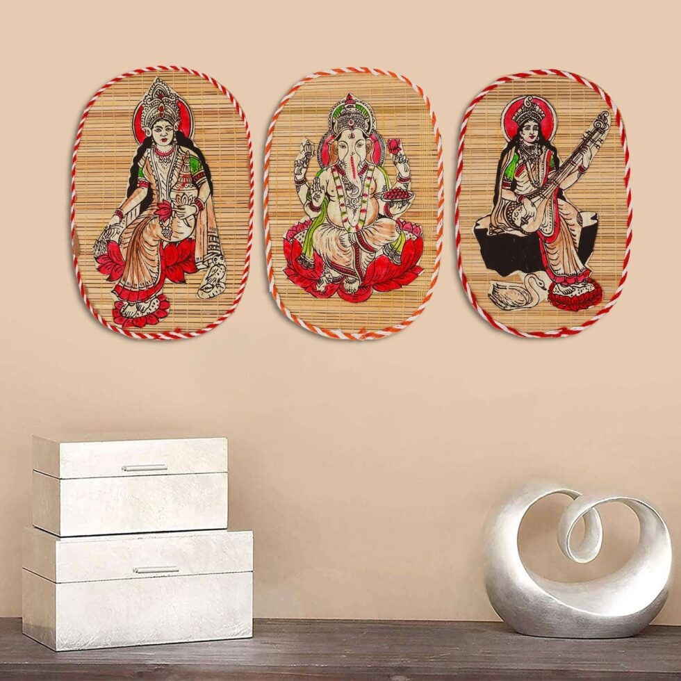 Bamboo Hand Crafted Wall Hangings Of The Trio Of Ganesh Ji, Laxmi Ji And Sarwasti Ji Painting For Home D?cor